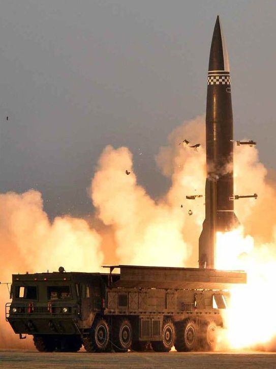 북한이 지난 3월25일 함경남도 함주군 일대에서 시험발사에 성공한 KN-23 개량형 탄도미사일. 탄두중량 2.5t으로 성주 사드기지를 1발로 초토화할 수 있는 것으로 알려졌다. /조선중앙통신