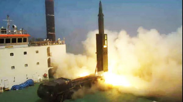 해상 바지선에서 시험발사되고 있는 사거리 800km 현무-2C 탄도미사일. 현무-4 미사일은 사거리 800km시 2t 탄두를, 사거리 300km시 4~5t 을 훨씬 능가하는 탄두를 장착할 수 있는 것으로 알려졌다. /국방부