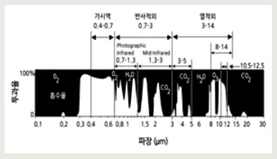 [그림 8] 파장별 대기 투과율 및 주요 흡수 기체