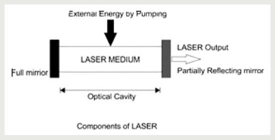 이득매질은 공급된 에너지에 의해 들뜬상태가 되는 물질로서 기체, 액체, 고체 등 구성물에 따라 분류될 수 있다. 공진기는 이득매질을 통해 빛(광자)이 왔다 갔다 할 수 있도록 전환시키는 소자로서 두 개의 거울로 구성되는데 한 쪽은 전반사(반사율 100%) 거울이지만 다른 한 쪽은 부분 반사 거울로서 증폭된 빛을 방출시키는 역할을 한다.