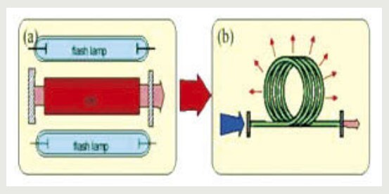 차후에는 이득 매질의 냉각을 용이하게 하기 위해 기하학적으로 변형하여 ROD의 직경을 작게 하고 길이를 길게 함으로써 표면적 비율을 높여 냉각 효율을 높이는 방식의 연구가 진행되었는데 이것이 광섬유 레이저의 유래라고 할 수 있다.