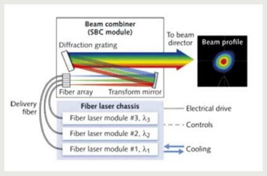 추가적으로 알아야 할 것은 앞에서 요약한 광섬유 레이저의 기본적인 구조로 인한 출력 증대 간 발생하는 현상도 문제이지만 이를 극복한다고 하더라도 단일 광섬유 레이저로부터 얻을 수 있는 최대 출력은 궁극적으로는 광섬유 물질이 손상되지 않을 임계값을 넘어설 수 없다는 것 또한 고출력 광섬유 레이저를 발생시키는데 있어 큰 제한사항이다. 결국 이 문제를 해결하는 것이 고출력 레이저 무기체계 전력화의 지름길이라 할 수 있다.