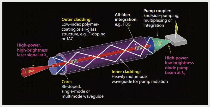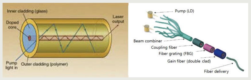 광섬유 레이저 구성 부품 중 광섬유 레이저의 발전을 가능케 한 부품으로 더블 클래딩 광섬유와 고출력 펌프 컴바이너가 있다. 펌프 레이저(LD)에서 나온 펌프 광을 이득 매질인 Gain 광섬유에 효율적으로 입사시키는 것이 고출력 펌프 컴바이너라면 입사된 광이 전달되는 Gain 광섬유는 펌핑 효율과 광 출력을 높이기 위해 광섬유의 클래딩이 2개로 구성되어 더블 클래딩 광섬유라 불린다.