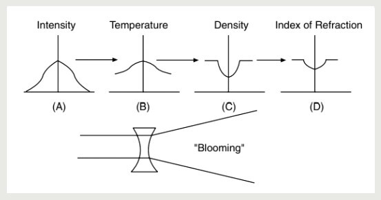 단점 ➊ 대기 감쇠 및 난류의 영향이다. 이는 대기 중 입자(먼지, 연기), 수증기 또는 대기난류 등에 의해 흡수(에너지 감소, 열적 확산, 대기 방전), 산란 등의 현상이 발생하는데 이는 거리에 따라 에너지가 줄어드는 것뿐만 아니라 동시에 굴절되어 표적에 원하는 에너지를 투사할 수 없게 된다. 이에 대해서는 이미 레이저를 민간분야에 활용하기 위해 선행된 연구에서 밝혀진 내용으로 오늘날 적응광학기법을 이용한 난류 극복이나 산란을 포함한 에너지 감쇠 현상들을 극복하기 위한 노력이 이루어지고 있다. 고출력 레이저를 활용 시 대기조건에 대한 의존도가 높아짐에 주의해야 한다.