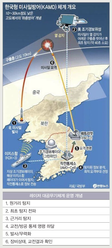 레이저 대공무기체계의 운용 개념은 우리 군의 방공작전 수행절차에서 타격 시 기존 방공무기(패트리어트, 이지스함 SM3, 신궁 등)를 대신하여 레이저 대공무기를 타격수단으로 사용하는 것으로 생각할 수 있다. 최근 북한 탄도미사일 위협이 증대됨에 따라 대응책으로 나온 한국형 3축 체계 중 한국형 미사일방어체계(KAMD, [그림 10])를 이해한다면 레이저 대공무기체계의 운용 개념을 보다 쉽게 이해할 수 있다. [그림 11]은 사거리 내 접근한 공중 표적과의 교전 절차를 나타낸다.