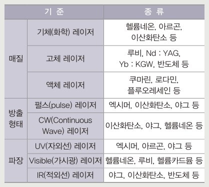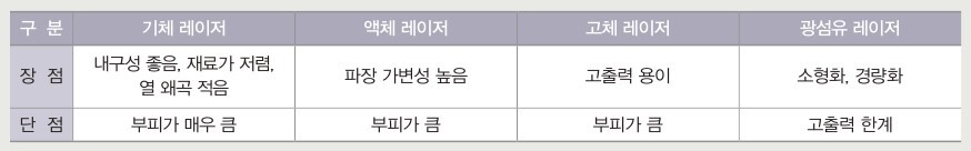 [표 4] 기체·액체·고체·광섬유 레이저 장·단점