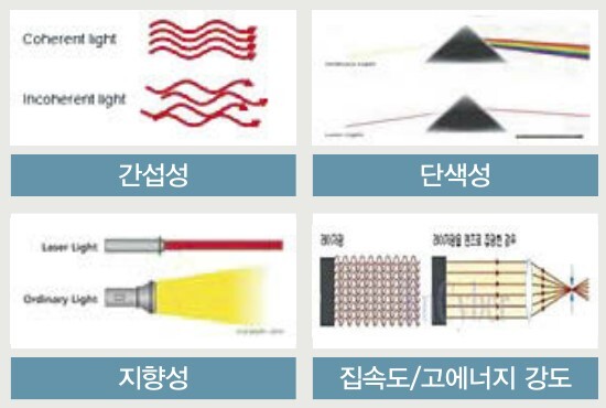 앞에서 소개한 다양한 레이저 또한 결국 빛이기 때문에 광학적 특징을 가지게 되는데 대표적으로 단색성, 간섭성, 지향성, 집속도, 고에너지 강도라고 할 수 있다.