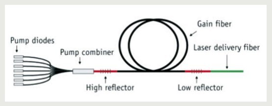 이후 설명될 고출력 광섬유 레이저에 대해 이해하기 위해 기본적인 광섬유 레이저에 대해 알아보자. 광섬유 레이저란 레이저의 기본 구성요소 중 공진기가 가늘고 긴 광섬유로 이루어진 레이저를 말하며 이때 이득매질은 광섬유 중앙에 유리가 첨가된 불순물 원자로 만들며, 입력되는 레이저 신호를 직접 증폭할 수 있기 때문에 고출력을 얻는데 주로 사용된다.