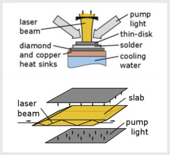 때문에 이득 매질의 고온발열을 방지하고 레이저빔의 집광성 개선을 위하여 디스크DISK 및 슬래브SLAB 형태로 발전하게 되었다.