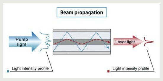 펌프 다이오드 레이저는 [그림 23]과 같이 파이버의 클래드를 통해 전반사하면서 파이버 코어에 흡수된다. 흡수된 빔은 빛을 방출하고, 거울 역할을 하는 FBG에 의해 빔이 증폭된다. 앞서 광섬유 레이저의 장점에서와 같이 빛의 펌핑에서부터 레이저출력의 모든 과정이 파이버의 내부에서 이루어지기 때문에, 외부 충격에 강하고 광학계의 정렬이 필요 없는 것이 특징이다.