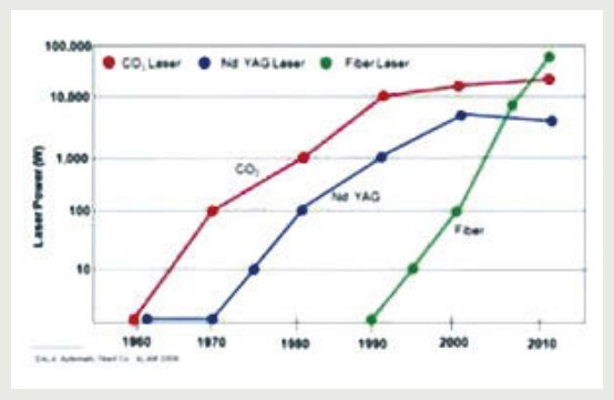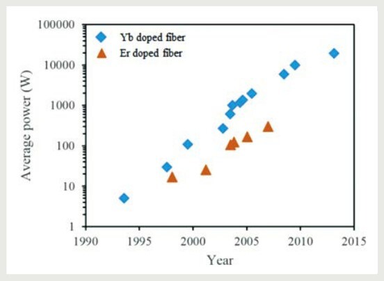 이후 광섬유 레이저는 연도별로 발전을 거듭하였는데 1960년대 초기 형태 광섬유 레이저가 개발된 이후 1980년대 이르러 희토류 광섬유를 이용한 최초의 단일모드 광섬유 레이저 및 증폭기가 개발되었고 1990년대 말 광섬유 레이저를 이용한 광통신 및 인터넷 관련 시장의 포화와 거품 붕괴로 인해 2000년대에 들어서는 기체 및 고체 레이저 대체 고출력 광섬유 레이저 연구 분야가 개척되기 시작했다. 2000년대 초반에 최초의 kW급 고출력 단일모드 광섬유 레이저가 개발되었고 2000년대 후반 및 2010년대에는 kW를 상회하는 단일모드 광섬유 레이저가 상품화되었다.
