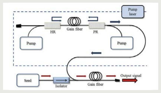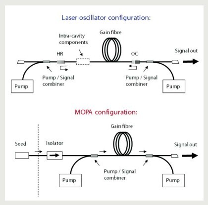 고출력 광섬유 레이저 시스템은 구현하기 간단하고 효과적인 레이저 공진기 구조가 있는 반면 특수한 성질을 갖는 고출력 레이저를 생성하도록 구현된 주공진기 출력 증폭기 구조(MOPA)가 있다. 다만 MOPA 구조는 추가적인 장비(Isolator)와 증폭 시 잡음 발생 및 출력 레이저 왜곡 가능성을 배제할 수 없는 단점이 있다.