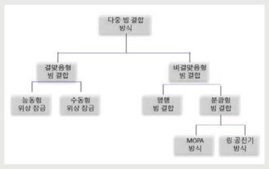 고출력 레이저 무기체계의 전력화에 필요한 첨단 기술로서 다중 빔 결합 기술은 말 그대로 다수의 광섬유 레이저 빔을 단일빔으로 결합하는 기술로서 결합된 빔은 단일빔 수준의 빔 품질 특성을 가지게끔 된다. 다중 빔 결합 방식은 [그림 30]과 같이 분류된다.