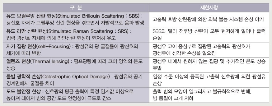 앞서 설명한 광섬유 레이저의 장점을 기반으로 다양한 구성 부품 및 시스템 구조는 가용 출력 성장을 가능케 하였다. 허나 고출력의 레이저 신호광이 좁은 코어 영역 내에서 전파해 나갈 수밖에 없는 기본적인 구조로 인해 출력이 증대되면 될수록 시스템의 안정성을 저해하는 여러 현상들을 마주하게 되는데 [표 5]는 고출력 광섬유 레이저의 출력 증대에 따른 현상을 요약한 것이다.