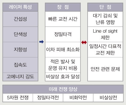 레이저가 빛으로서 광학적 특성을 가지기 때문에 무기체계 활용 시 장점과 단점이 예상된다.