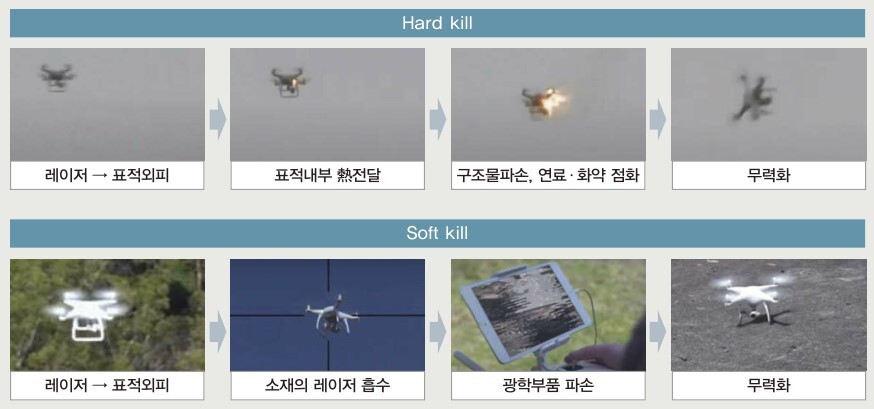 무인기를 포함한 공중 표적에 대응하기 위한 레이저 대공무기체계의 무력화 원리는 크게 Hard kill과 Soft kill로 나뉜다. Hard kill은 실제 날아오는 무인기나 미사일의 표면을 파괴하거나 폭파시켜 무력화하는 것이라면 Soft kill은 표적이 가지고 있는 센서나 조종장치를 혼란스럽게 만들어서 무력화 시키는 것이다. [그림 9]는 Hard kill과 Soft kill 방식을 보여 준다.