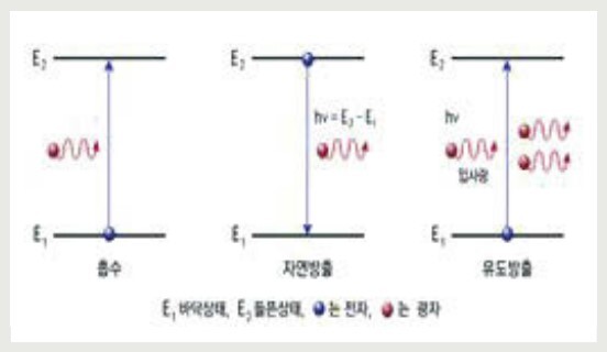 이 때 흡수하거나 방출하는 에너지의 형태가 빛이 될 수 있다. 전자가 가장 낮은 에너지 궤도에 있을 때를 ‘바닥상태’, 일정한 에너지(hν)를 흡수하여 높은 에너지 궤도에 있을 때를 ‘들뜬상태’라고 할 때 ‘유도흡수’ 과정은 전자가 들뜬 상태가 되기에 충분한 에너지(hν)를 흡수하는 과정이다.