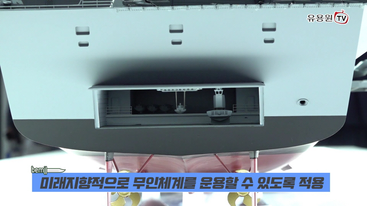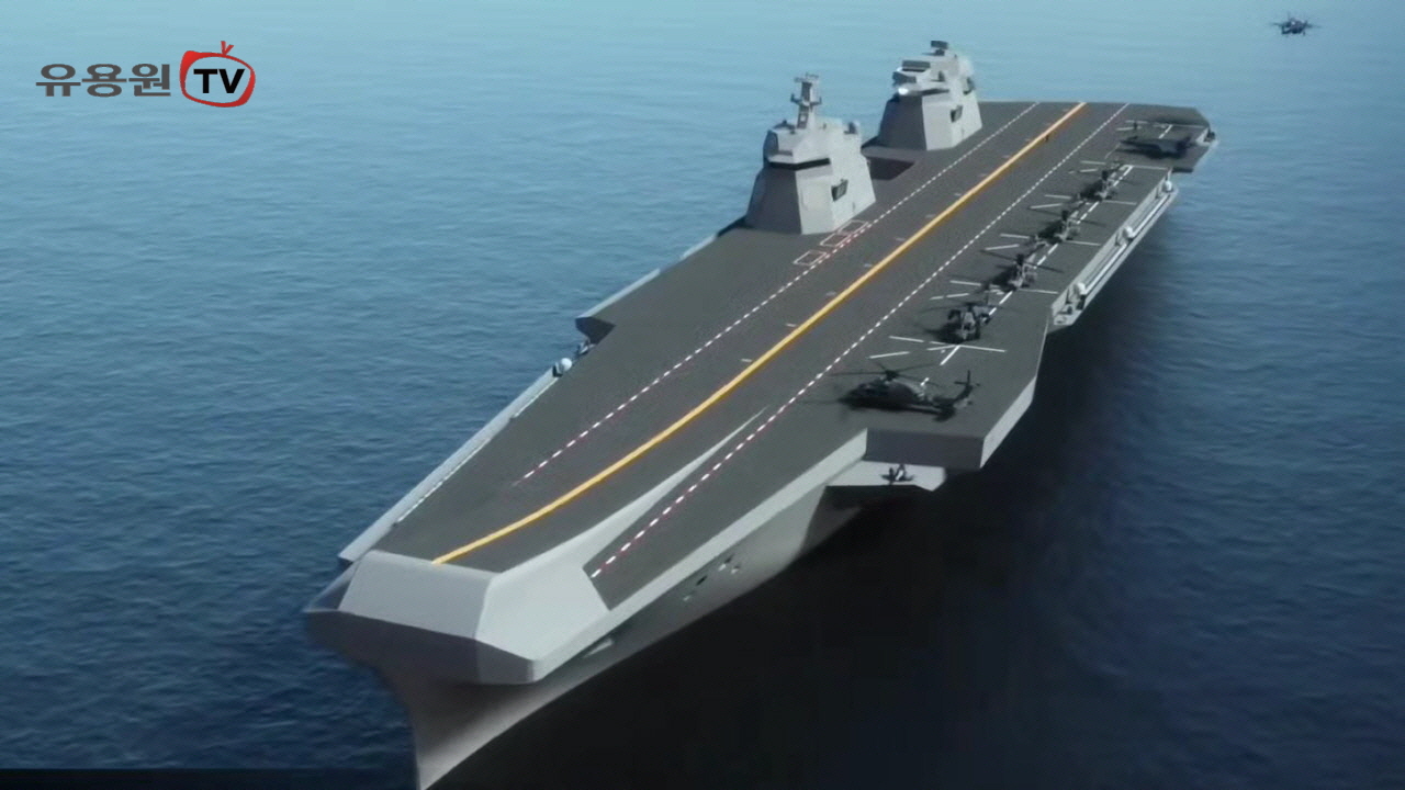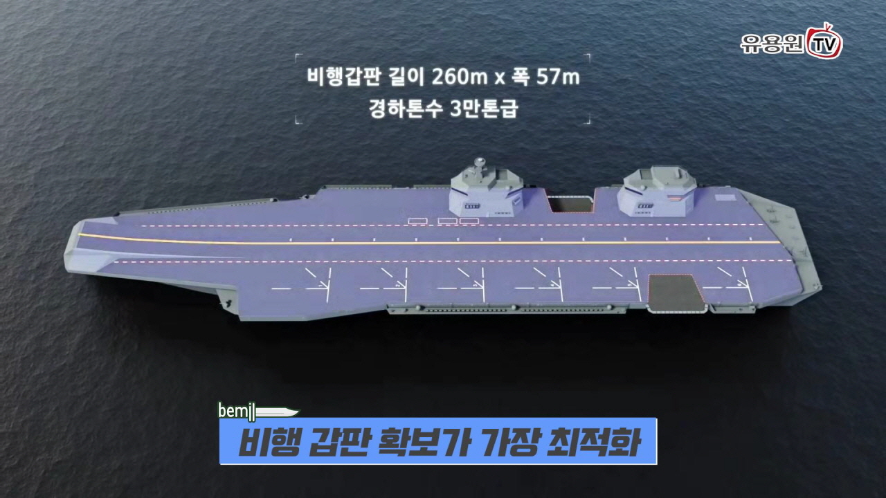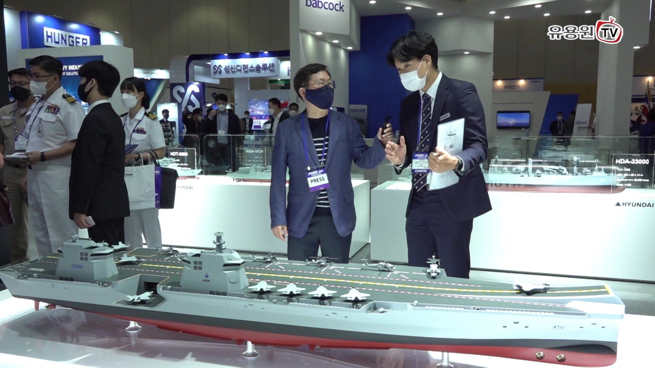 ‘국제해양방위산업전(MADEX) 2021’ 부스에 선보인 현대중공업 3만톤급 한국형 경항공모함(CVX) 현장취재 영상입니다. 스키점프대를 적용하고 비행 갑판을 넓혔지만 기준배수량은 3만톤급으로 변함이 없다고 하는데요 새로이 선보인 갑판 확장형 경항모는 혁신적 설계로 5만톤급 중항모와 맞먹는 전투기 주기 공간 확보와 작전효율성을 가지고 있다고 합니다.