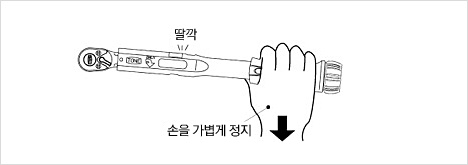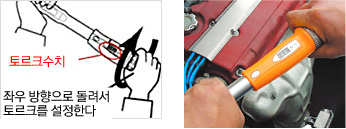 그리고 위의 오른쪽 그림과 같이 화살표 방향으로 돌려 체결 설정된 토르크 값에 도달하면 "딸깍"소리 나므로 이때 손에 가벼운 '진동과 슬립' 느껴지면 체결이 완료됩니다.