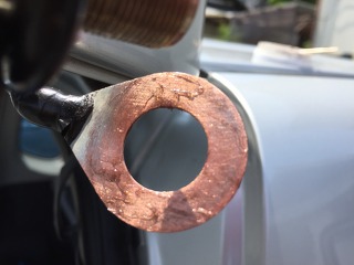 접지 케이블은 볼트에 의해 강하게 압박되어 엔진에 접촉하고 있기 때문에, "코파스립 (COPASLIP) 구리스" 에 포함 된 구리 입자가 금속의 요철표면에 분쇄 되면서 거친 입자속으로 들어갑니다.