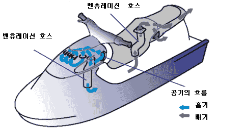 헤치에 있는 구멍은 캬브레이터 (기화기)에 새로운 공기를 보내기 위해서, 그리고 엔진룸의 환기를 위해서 입니다.주행하면 엔진룸 내부에 공기가 흐르기 시작합니다。그러므로 흡입라인의 구멍이 이물질로 막히지 않도록 해주세요