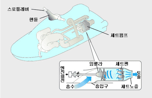 선체의 외부에는 프로펠라가 없습니다。젯트부분의 안쪽에 "인펠라"(프로펠라 대용)가 있어 이 인펠라에 의해서 선체아래로부터 물을흡입하여 올립니다。물은 고속 고압으로 노즐을 통하여 분사되어 PWC의 추진력을 발생시킵니다。엔진이 걸려있을때 인펠라는 회전하고 있으므로 손과 발, 머리, 의류등이 흡수구와 노즐부분 가까이 가지 않도록 합니다。