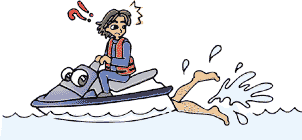 떨어졌을때 안전키 코드를 몸에 연결하고 있지않으면 PWC의 엔진을 즉시 멈출수 없게됩니다。PWC를 운전하는 사람은 왼쪽손목에 「안전코드」착용하고 운전합니다。떨어졌을때 이 코드 끝에있는 록크플레이트가 긴급하게 엔진정지 스위치에서 빠져 엔진을 정지시키는 구조로 되어 있습니다。조작에 자신이 있는사람도 안전코드는 필히 손목에 착용하여야 합니다。