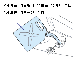 | ● | 4사이클 엔진의 경우 연료는 가솔린만을 사용합니다。길들이기의 연료는 지정된 연료등급을 필히 사용하세요。 |