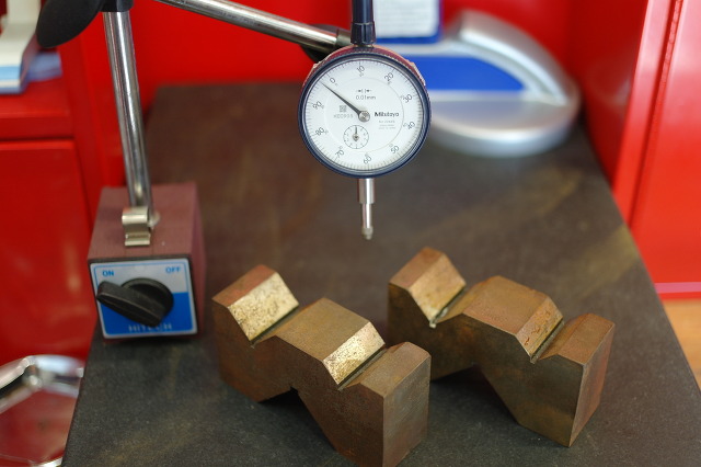 샤프트를 V블록의 양 끝단의 설치한 다음 다이얼게이지를 세팅합니다.