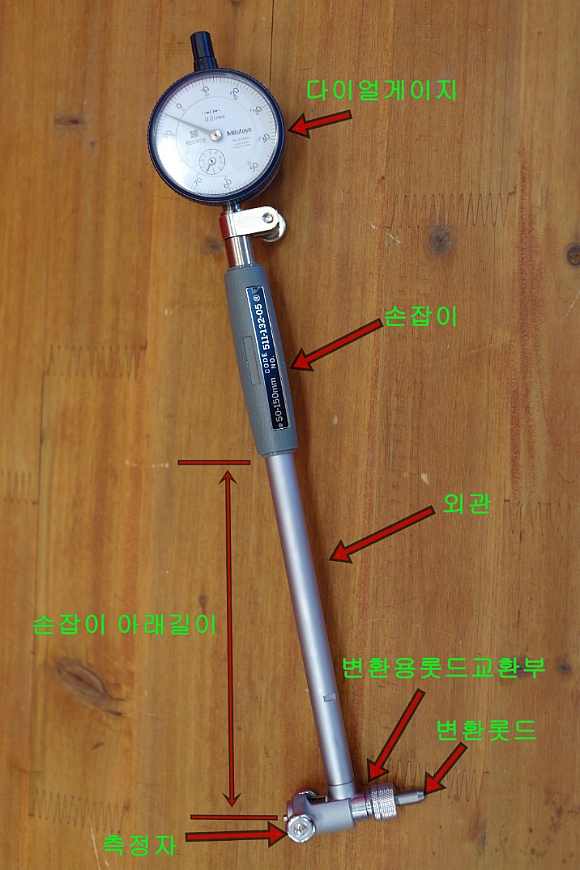 하단부의 좌우에 신축하는 측정자의 움직임을 전도자를 경유하여 다이얼게이지의 눌러 올리는 구조로 되어잇으며 측정부의 사이즈는 수종류의 교환식 롯드와 보조 와셔에 의한 조정식으로 되어 있습니다.