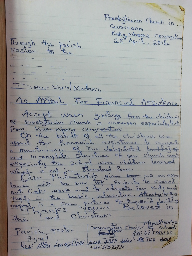 오늘 카메룬에서 온 Mbu Livingstone 목사의 교회와 이 교회에서 운영하는 초등학교 후원을 요청하는 편지를 전해 받았습니다.