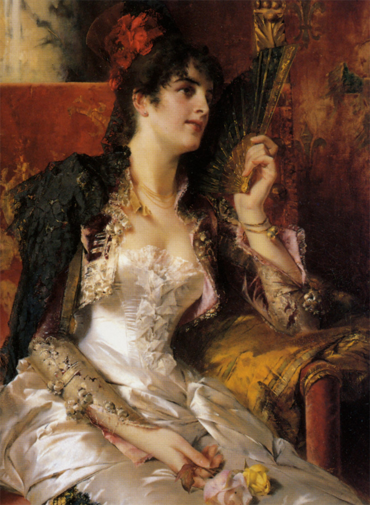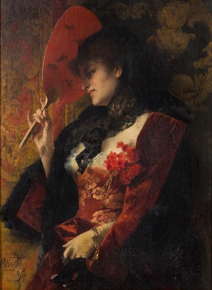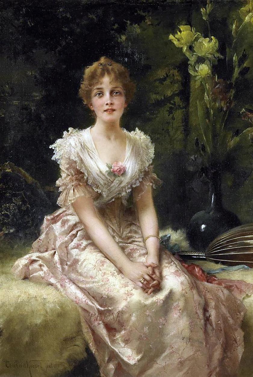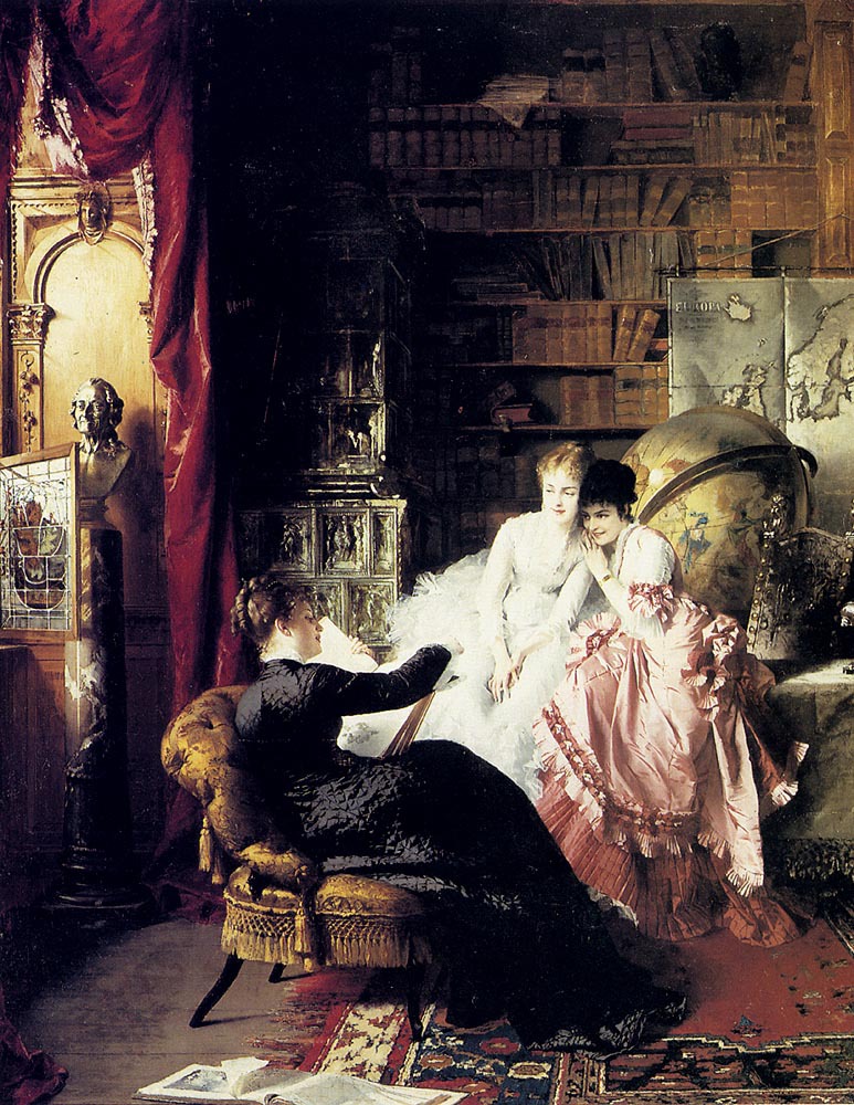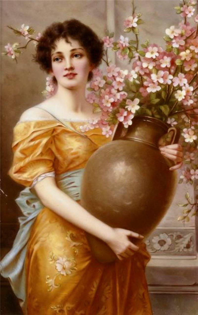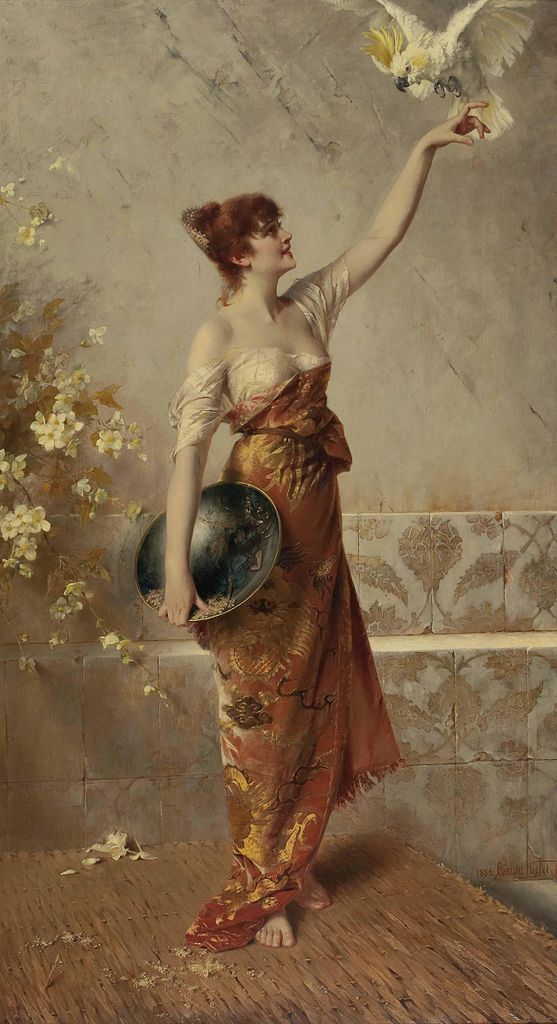 그는 아름다운 인테리어에 젊은 아름다운 소녀 또는 여성을 묘사하는 것을 선호했다.