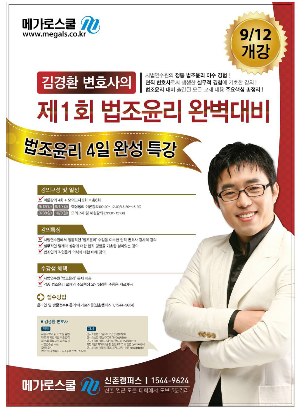 제1회 법조윤리시험(2010.10.9 시행) 대비 전문특강을 아래와 같이 개설하오니 로스쿨 재학생 여러분의 많은 참여 바랍니다.