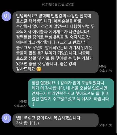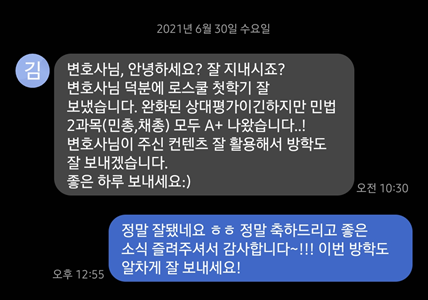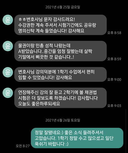 - 로스쿨 13기 대상 민법선행강의 제공(약 60여명 이상 수강)