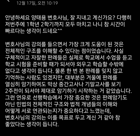 선행공부법과 저의 선행강의의 필요성에 대하여 단30분짜리 영상을 녹화했습니다. 30분만 투자해서 동영상을 완독하시면 3년의 로스쿨 생활의 방향이 정말 달라질 수 있다고 생각합니다. 꼭 본 영상을 보시고 선행학습 계획에 참고하시고 저의 선행강의에 관심이 있으시면 신청문의 주시기 바랍니다!