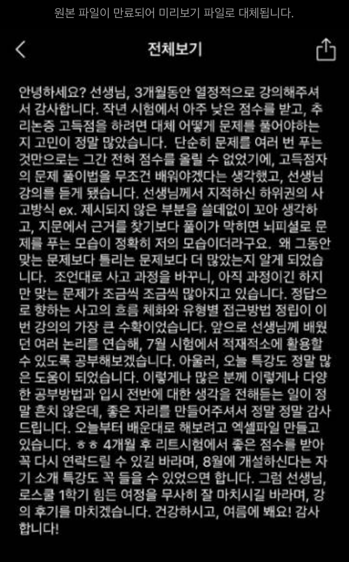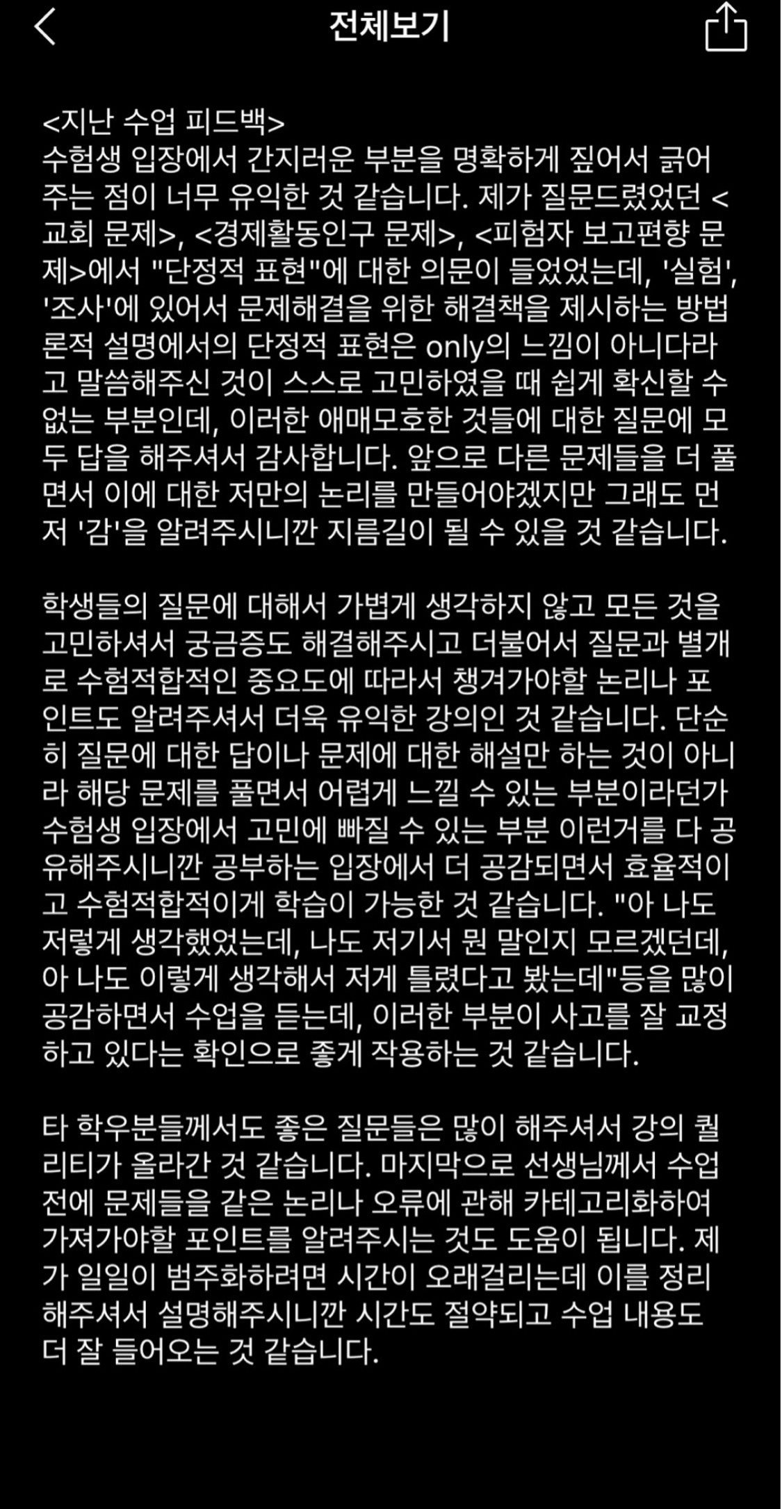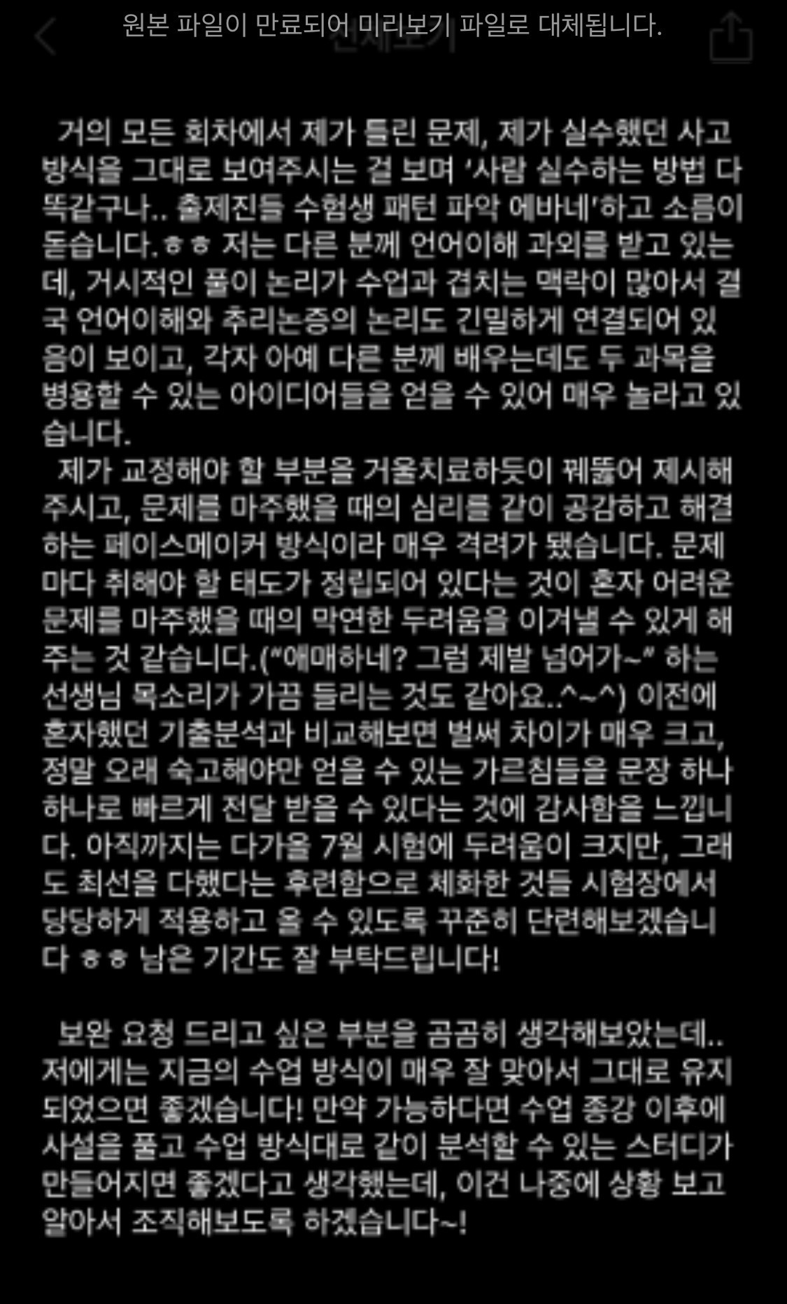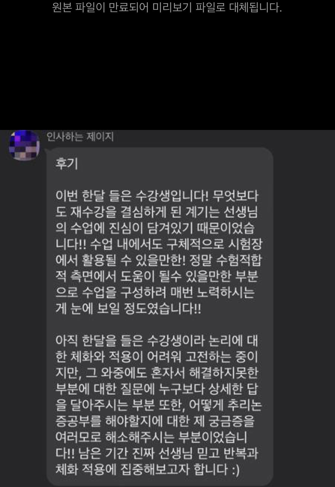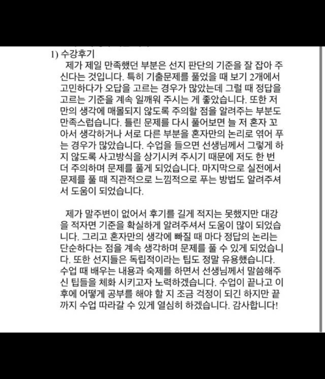 | [1. 강의 목표] 1) 6개월 리트 대비 '로드맵' 제시 LEET는 그 동안의 공부와 달리 정해진 커리큘럼도 없고, 6개월간 스스로 완성시켜야하는 시험입니다. 이에 더해 마땅히 '시험 범위'라고 할 것이 없어 어디서 부터 시작할지 막막하고, 공부한다고 점수가 오를지 불안했던 시절이 있었습니다. 같은 시험을 앞서 경험해본 선배의 입장에서 어떻게 공부를 시작해야하고, 점수를 어떻게 향상시킬 수 있으며, 마지막에는 어떻게 빈틈없이 공부를 완성할 수 있을지 6개월 간의 로드맵을 제시해드립니다. 2) 유형별 ‘풀이방법론' 제시 실전에서 활용 가능한 유형별 '풀이방법론'을 제시하고, 오답률이 높았던 기출문제에 적용하는 방법을 보여드립니다. ‘추리논증’ 분야는 기출문제에서 요구하는 사고방식 및 풀이방식이 명확합니다. 예컨대 논증 부분에서는 지문을 정확히 읽고 이해한 뒤 선지를 판단하여야 하는 문제가 많다면, 추리 부분에서는 지문을 정확히 이해하지는 못하였더라도, 도식화된 이해를 통하여 선지 판단이 가능한 문제들이 다수입니다. 시험장 내에서는 이와 같은 유형별 풀이법을 체화하여 문제별로 접근법 및 시간분배를 다르게 가져가야합니다. 이에 강사진이 직접 제작한 ‘추리논증 유형별 문제집'을 토대로 유형별 풀이법을 제시해드립니다. 물론, 모든 문제를 풀어낼 수 있는 공식을 찾기는 어렵습니다. 그러나 문제 유형에 따라 출제자가 요구하는 ‘사고 흐름'은 분명히 존재하고, 그 흐름을 토대로, 자신만의 문제풀이 노하우를 습득하실 수 있습니다. 3) 실전형 강의 수험생 시절 추리논증 강의들을 들으며 문제들에 사후적으로 접근하여 이미 알고있는 답에 끼워맞추는 식의 풀이법에 아쉬움을 느꼈습니다. 이와 같은 강의는 실전에서 활용할 수 없을 뿐더러, 문제가 조금만 바뀌어도 적용할 수 없다는 단점이 있습니다. 저희 강의는 실전에서 고득점을 올리는 방법에 중점이 맞추어져 있습니다. 이에 기출문제를 ‘사전적'으로 접근하며 실제 고득점자들이 문제를 처음 접했을 때 지문을 어떻게 읽고, 선지를 어떻게 푸는지를 전수해드립니다. 이에 더해 해설지를 통해 해결되지 않는 의문을 수험생의 입장에서 어떻게 생각해야 풀어낼 수 있었을지에 초점을 맞추어 설명해드립니다. 4) 분담형 강의 많은 학생들을 가르치며 느낀 고민을 나누며 어떻게 해야 더 잘 가르칠 수 있을지 개선점에 대해 고찰했습니다. A강사와 B강사가 각자 갖고 있는 노하우들을 함께 나누면, 하위권이 갖고 있던 고민을 더 잘 풀어내고 상위권에서 최상위권으로 도약할 수 있는 방법을 효율적으로 전달할 수 있다고 판단했습니다. 이에 유형별로 편집한 문제에 대해 각자 가지고 있는 인사이트를 교류한 후, 보다 타당한 인사이트를 갖고 있는 문제를 분담하여 설명하는 방식을 결정했습니다. 해당 문제를 설명하는 강사의 관점과 다른 강사의 관점을 비교하고 싶다면 강사 개인이 연도별로 푼 기존 기출영상을 참고할 수 있다는 데 차별적인 장점이 존재합니다. [2. 강의 일정] 1) 교재 -- <기출 유형별 고난도 모음집> (자체 제작) 2) 커리큘럼 -- 기초이론 + 기출풀이 영상 [기초이론(상)] 1강: OT + 언어추리(1) 2강: 언어추리(2) 3강: 언어추리(3) 4강: 명제추론(4) 5강: 논증 6강: 논리게임 [기초이론(하)] 7강:가설 8강: 논쟁(1) 9강: 논쟁(2) 10강: 수리추리 11강: 법률(1) 12강: 법률(2) 기출풀이 part 1 13강: 13년도 기출풀이 14강: 14년도 기출풀이 15강: 15년도 기출풀이 16강: 16년도 기출풀이 기출풀이 Part 2 17강: 17년도 기출풀이 18강: 18년도 기출풀이 19강: 19년도 기출풀이 20강: 20년도 기출풀이 기출풀이 Part 3 21강: 21년도 기출풀이 22강: 22년도 기출풀이 23강: 23년도 기출풀이 24강: 24년도 기출풀이 Q&A (6월) - 2월은 유형별 기초이론을 다지고 풀이법을 익히는 시간으로 활용됩니다. 단, 기출문제에 대한 감을 최대한 빨리 익히는 것이 중요하므로 09~12년도 기출문데 풀이를 병행합니다. - 3~5월은 기초이론에서 터득한 내용으로 기출문제를 풀이하는 시간으로 활용됩니다. - 6월은 기출문제 중 미흡했던 부분을 돌아보고, 강사와 Q&A를 통해 공백을 메우는 식으로 진행됩니다. 3) 보충 영상 -- 강사 별 기출문제 풀이(13년도~24년도 연도별 풀이) 영상 제공 (강사별 실제 과외 영상) -- 고득점자의 실제 풀이법을 확인하며 수업에서 배운 내용을 실전에서 활용하는 법을 체득하실 수 있습니다. [3. 강사 소개] 1) 강사A (논증 담당) <약력> 現 서울대 로스쿨 재학 강사 모의고사 출제 경험 有 추리논증 백분위 (21 LEET 38.5% -> 23 LEET 96.3%) 누적 수강생: 45명 2023 서울대 로스쿨 / 연세대 로스쿨 최종합격 <자기 소개> 머리가 좋지 않았습니다. 그렇기 때문에 LEET를 3번 치뤘습니다. 평범한 머리와 부단한 노력에 약간의 운이 더해진다면, 원하는 바를 이룰 수 있음을 체감해 왔습니다. LEET를 좋지 않은 머리로 어떻게 공부해야 할지 방법론과 내용에 대해 끊임없이 고민해봤기에 중하위권이 느끼는 어려움에 대해 깊이 공감합니다. LEET 신수설은 반은 맞고 반은 틀린 이야기라고 생각합니다. 처음부터 잘하시는 분들이 있기에 반은 맞는 이야기고, 저처럼 처음부터 잘하