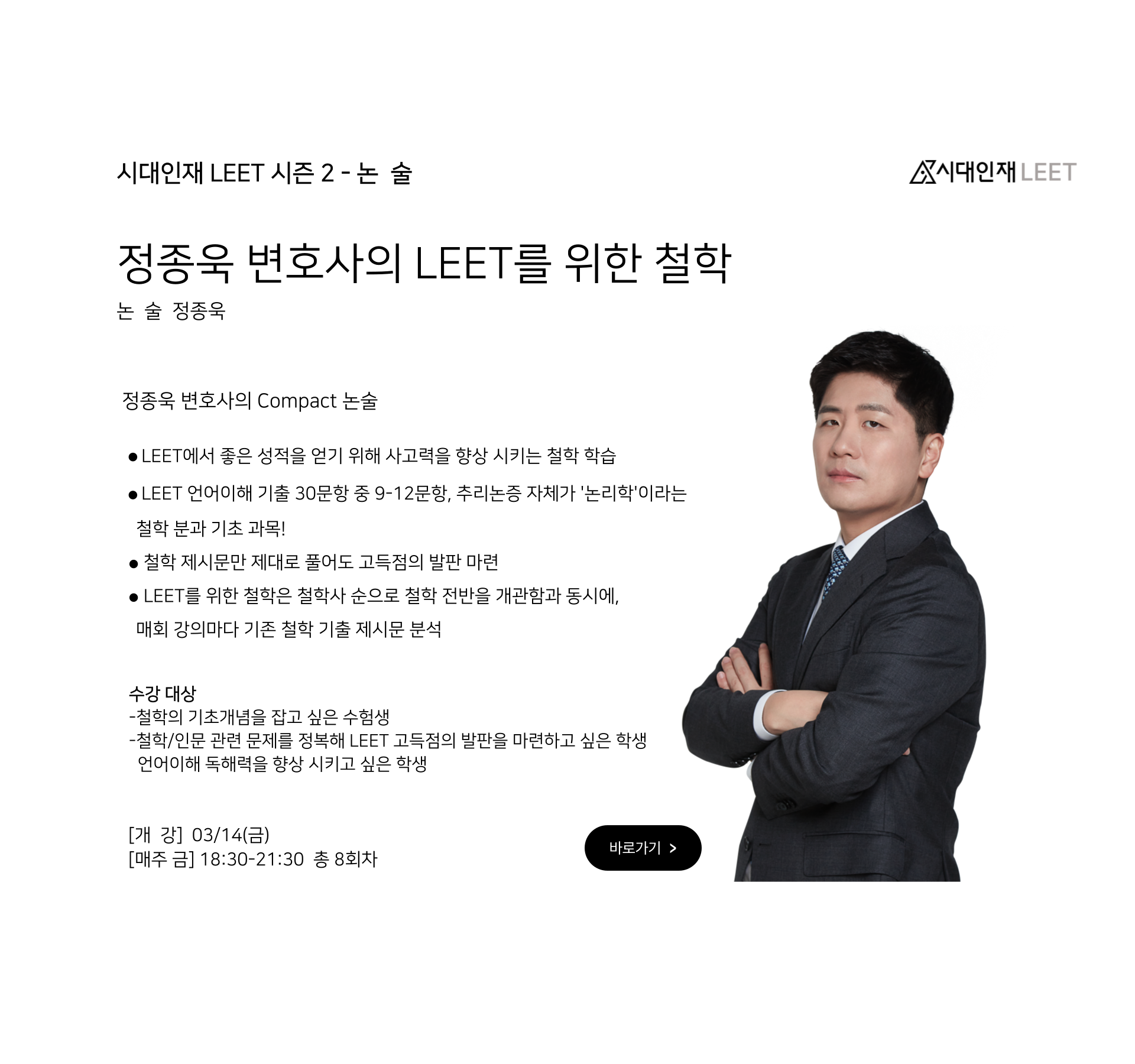 [시대인재LEET] 정종욱 변호사의 LEET를 위한 철학 작성자시대인재 LEET|작성시간25.02.18|조회수77 목록 댓글 0 글자크기 작게가 글자크기 크게가 다음검색 현재 게시글 추가 기능 열기 북마크 공유하기 신고 센터로 신고 댓글 댓글 0 댓글쓰기 답글쓰기 댓글 리스트