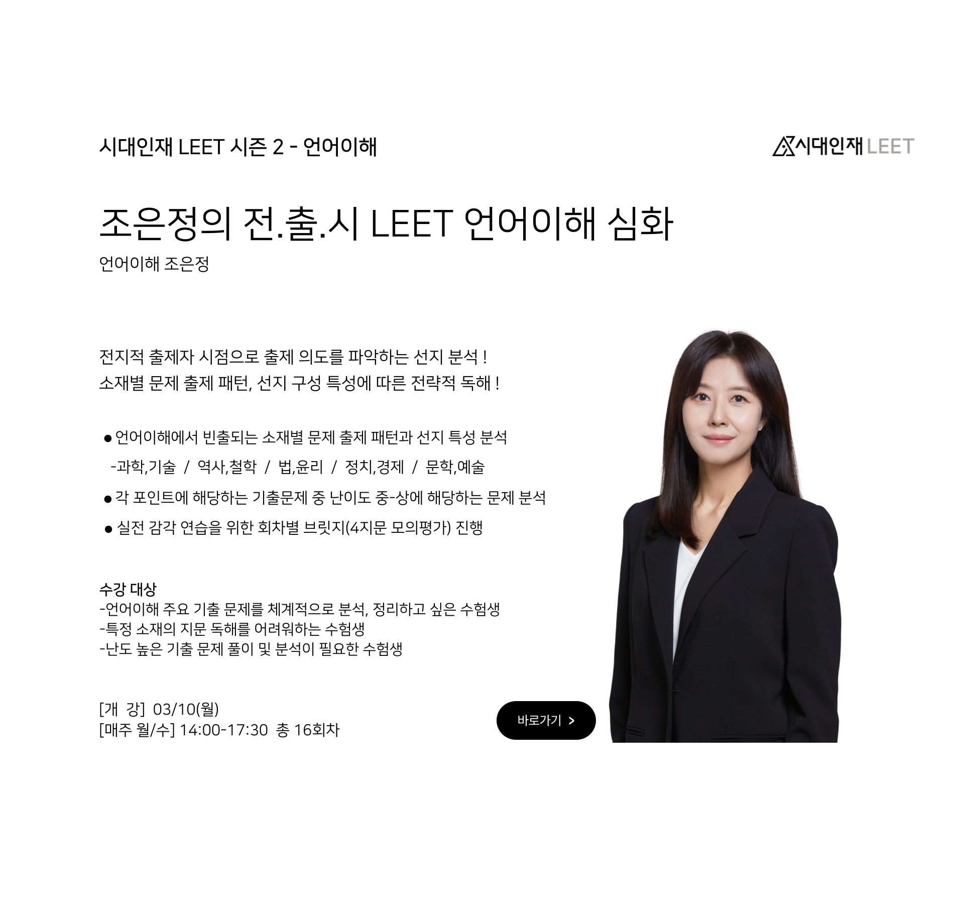 [시대인재LEET] 조은정의 전.출.시 LEET 언어이해 심화 강의 작성자시대인재 LEET|작성시간25.02.18|조회수221 목록 댓글 0 글자크기 작게가 글자크기 크게가 다음검색 현재 게시글 추가 기능 열기 북마크 공유하기 신고 센터로 신고 댓글 댓글 0 댓글쓰기 답글쓰기 댓글 리스트