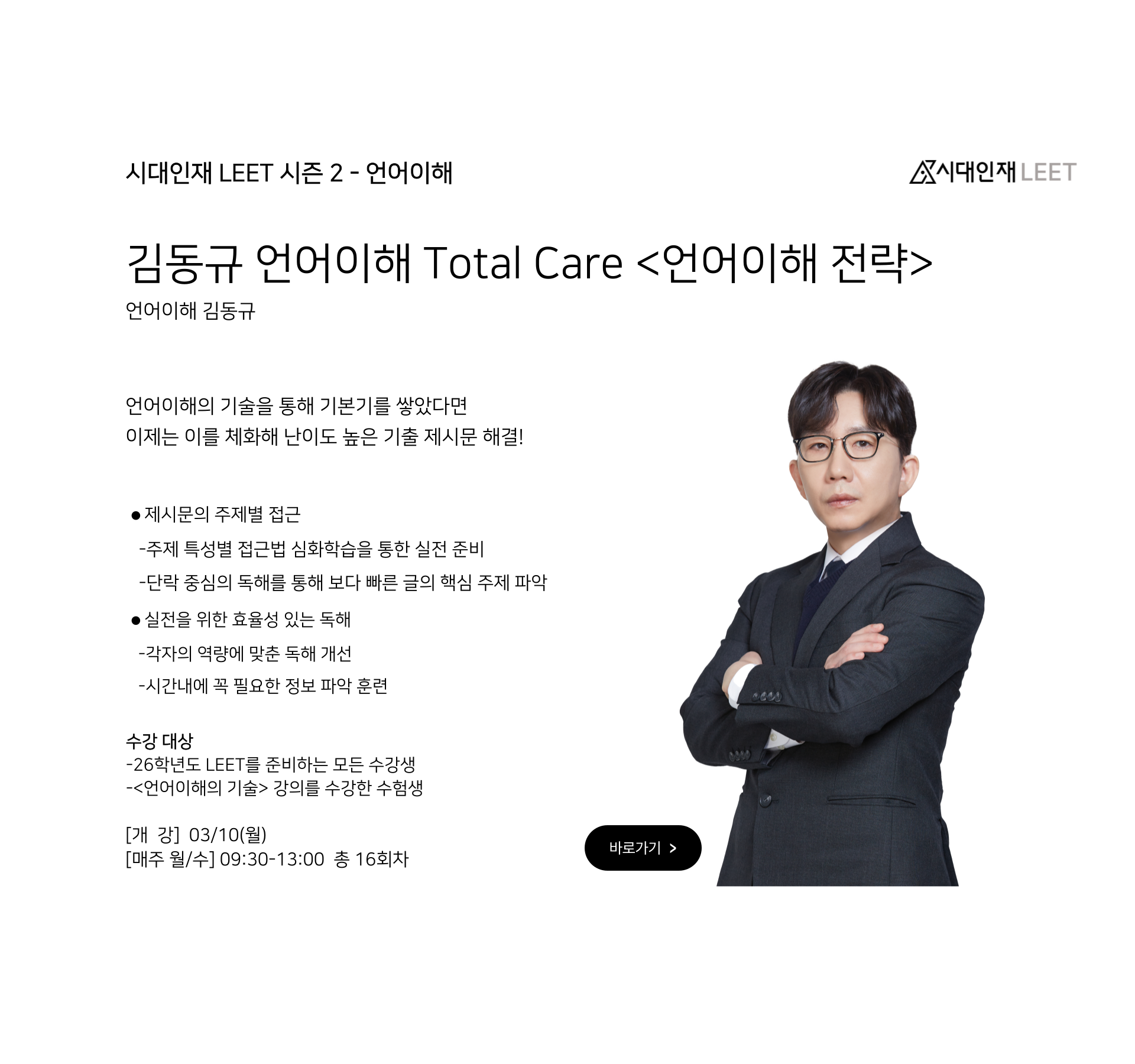 [시대인재LEET] 김동규 언어이해 TotalCare<언어이해전략> 작성자시대인재 LEET|작성시간25.02.18|조회수72 목록 댓글 0 글자크기 작게가 글자크기 크게가 다음검색 현재 게시글 추가 기능 열기 북마크 공유하기 신고 센터로 신고 댓글 댓글 0 댓글쓰기 답글쓰기 댓글 리스트