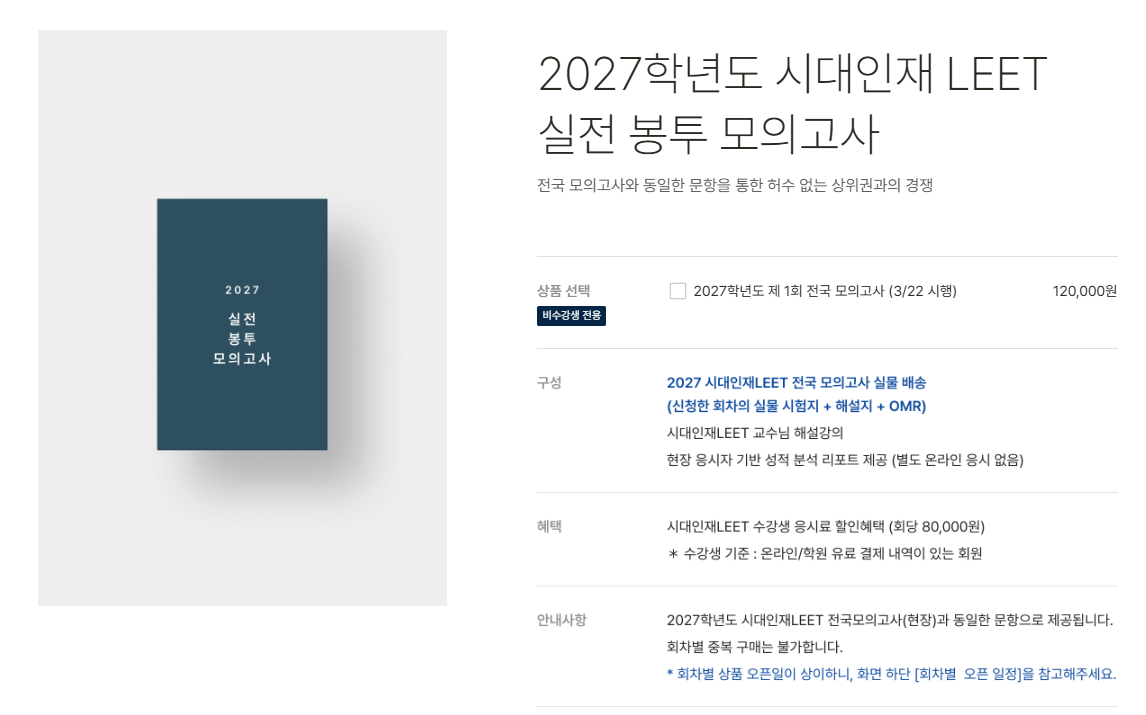 ① 2027학년도 시대인재LEET 전국 모의고사와 동일한 시험지로 구성