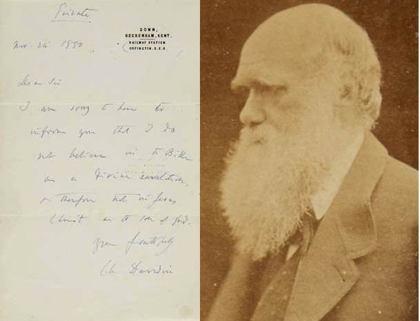 뉴욕 경매사이트 '본햄스'에 찰스 다윈의 종교적 소신을 담은 친필 편지가 경매에 나왔다. 사진은 다윈의 편지와 다윈의 모습이다.