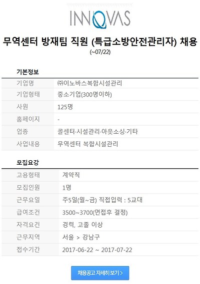 무역센터 특급소방안전관리자 채용 (계약직/연봉3,500~3,700만원) (~7/22) 작성자후추후추|작성시간17.06.28|조회수231 목록 댓글 0 글자크기 작게가 글자크기 크게가 본 채용정보는 좋은 일자리를 찾으시는 분을 위해 잡코리아가 드리는 정보입니다. 다음검색 현재 게시글 추가 기능 열기 북마크 공유하기 신고 센터로 신고 댓글 댓글 0 댓글쓰기 답글쓰기 댓글 리스트