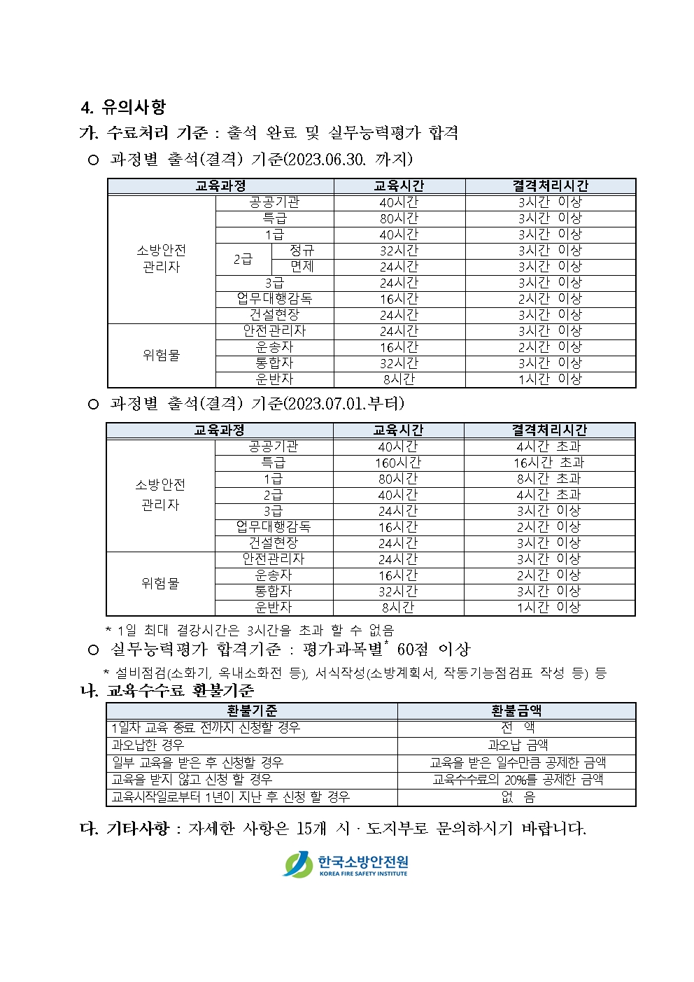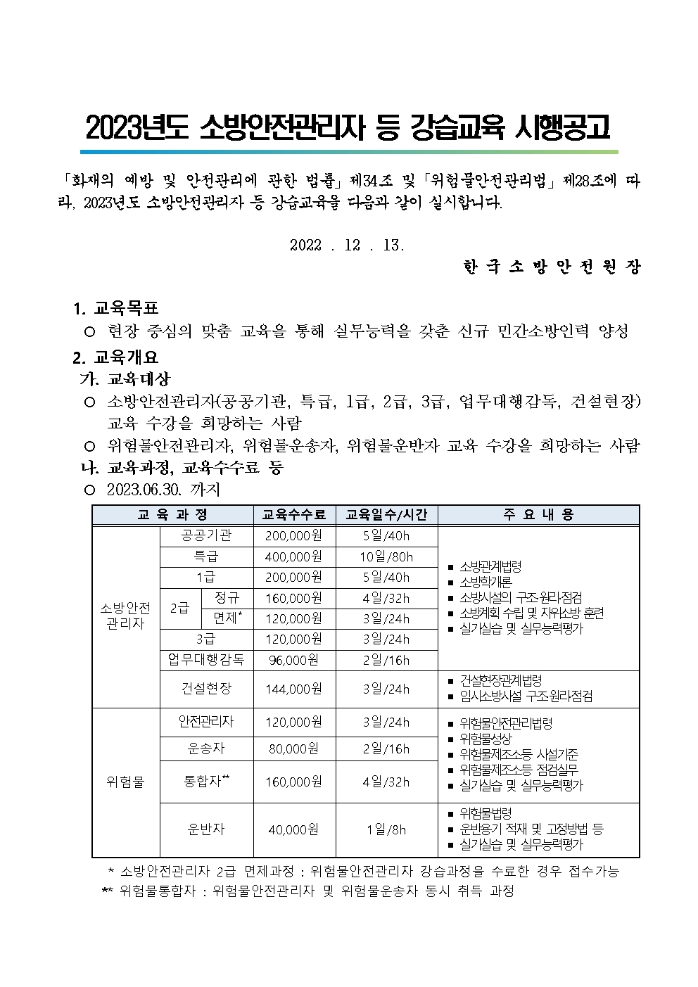 2023년도 소방안전관리자 등 강습교육 시행공고 (한국소방안전원) 작성자임진호|작성시간23.04.12|조회수958 목록 댓글 0 글자크기 작게가 글자크기 크게가 한국소방안전원 사이트 바로가기 (강습교육 신청, 실무교육 신청외)https://www.kfsi.or.kr/user/Intro.do 다음검색 현재 게시글 추가 기능 열기 북마크 공유하기 신고 센터로 신고 댓글 댓글 0 댓글쓰기 답글쓰기 댓글 리스트