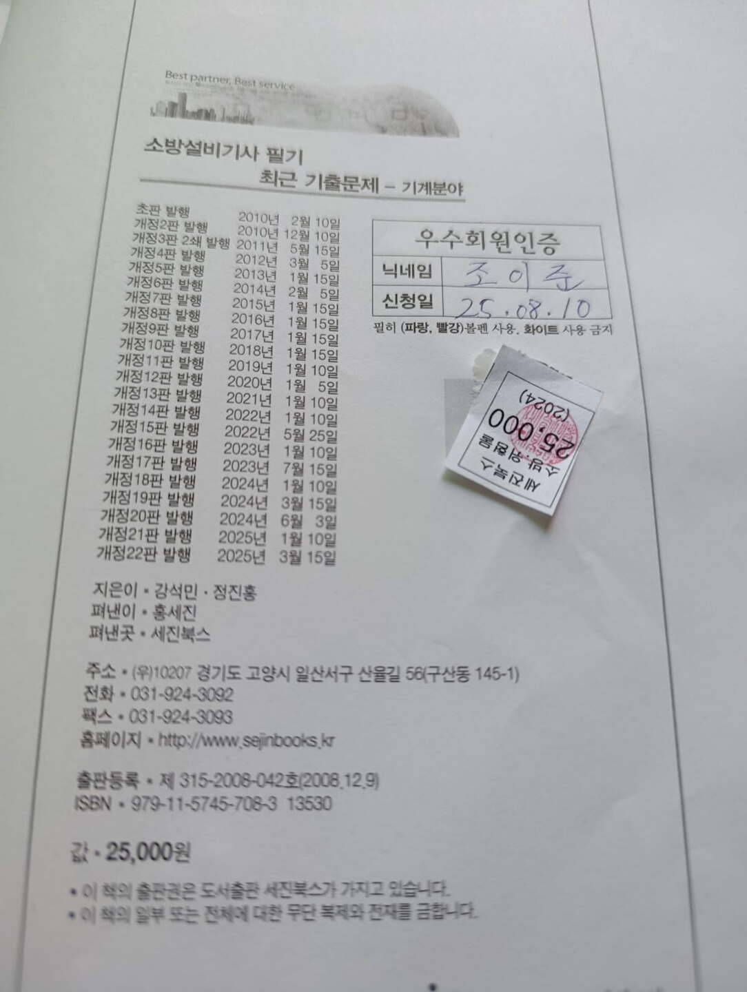 우수회원 신청합니다 작성자최경환|작성시간25.09.01|조회수39 목록 댓글 1 글자크기 작게가 글자크기 크게가 다음검색 현재 게시글 추가 기능 열기 북마크 공유하기 신고 센터로 신고 댓글 댓글 1 댓글쓰기 답글쓰기 댓글 리스트 작성자세진북스 | 작성시간 25.09.02 우수회원 등업 완료. 꼭 합격하세요.^^우수회원 자격기간은 필기 및 실기 평생 무료입니다.책으로 공부중에 오타나 오답이 있는 경우에는 질문방에 올려주시면저자분이 바로 답변 드리도록하겠습니다.^^** 꼭 정오표방에서 정오를 확인 후 공부하세요.** 댓글 전체보기