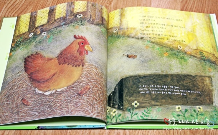 엄마 닭은 병아리를 포근하게 감싸 주었어요.