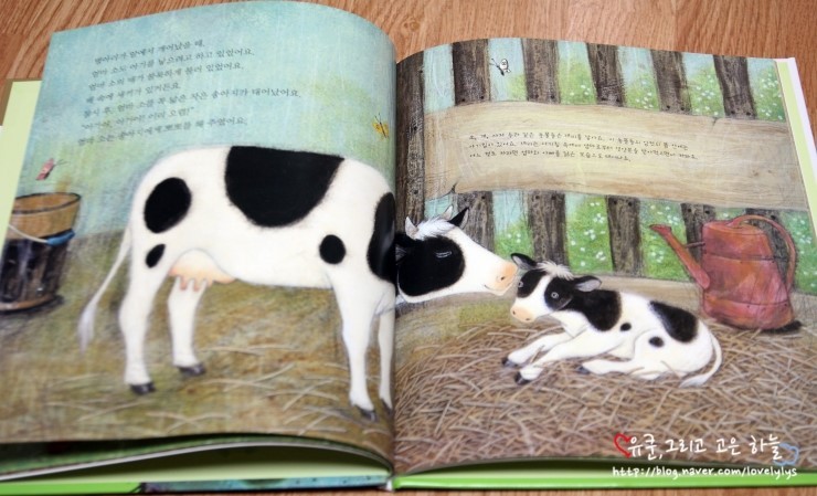 엄마 소는 송아지에게 뽀뽀를 해 주었어요.