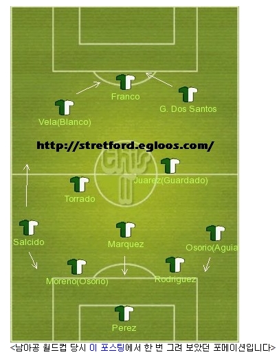 오소리오(Ricardo Osorio)와 로드리게스(Francisco Rodríguez)는 센터백 조합으로 뒤에 있다. 그리고 마르퀘스(Rafael Márquez)는 이 둘 앞에서 과거 용어인 센터 하프로 뛰고 있었던 거다. (역주: 현재의 잉글랜드에서 센터하프는 센터백의 동의어로 사용되고 있지만, 여기서 조나단 윌슨은 초창기 축구에서 사용했던 센터 하프의 의미로 사용하고 있는 겁니다) 아길라르(Paul Aguilar)와 살시도(Carlos Salcido)는 공격적인 풀백이다. 고로 수비 라인은 두 개로 구성된다. 센터백 둘과 풀백-센터 하프-풀백, 후아레즈(Efraín Juárez)와 토라도(Gerardo Torrado)가 중앙 미드필더이며 이들 앞에 세 명의 공격진 지도산(Giovani dos Santos), 프랑코(Guillermo Franco), 카를로스(Carlos Vela)가 선다. 이와 같은 포메이션을 정확히 표현하자면 사실 2-3-2-3이 맞다. 즉, 1934년과 1938년에 월드컵 우승을 차지한 비토리오 포조(Vittorio Pozzo's) 감독의 이탈리아가 사용한 W-W 포메이션과 같다는 말이다.