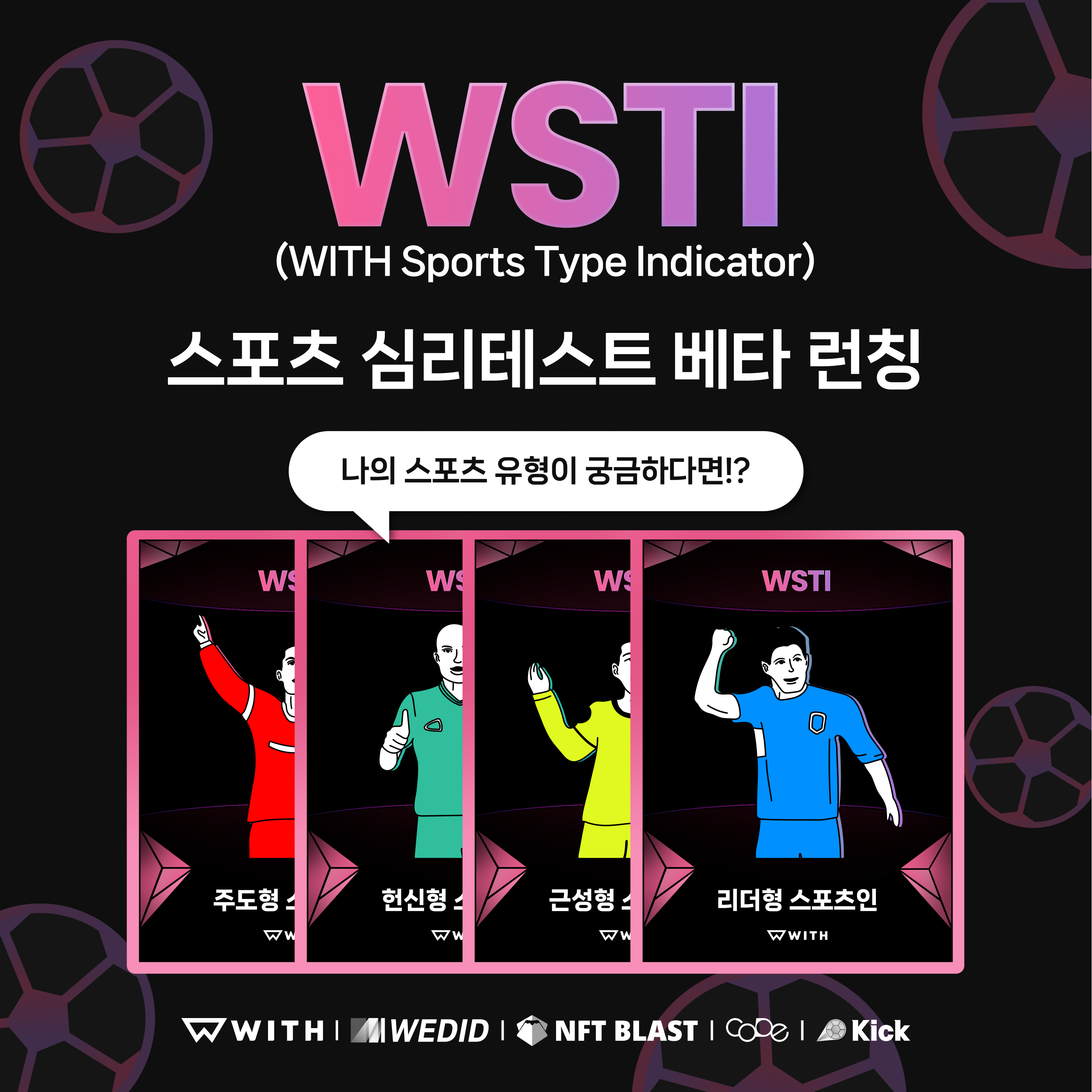 WSTI(WITH Sports Type Indicator, 프로젝트위드 선수 유형 지표)는 개인의 스포츠 성향을 과학적으로 보여주는 도구입니다. 자신의 스포츠 선수특성 및 스포츠 활동에서 필요한 예측역량까지 함께 알아볼 수 있는 일종의 심리테스트이자, 스포츠판 MBTI라고 생각하면 조금 더 쉽게 이해할 수 있을거에요.