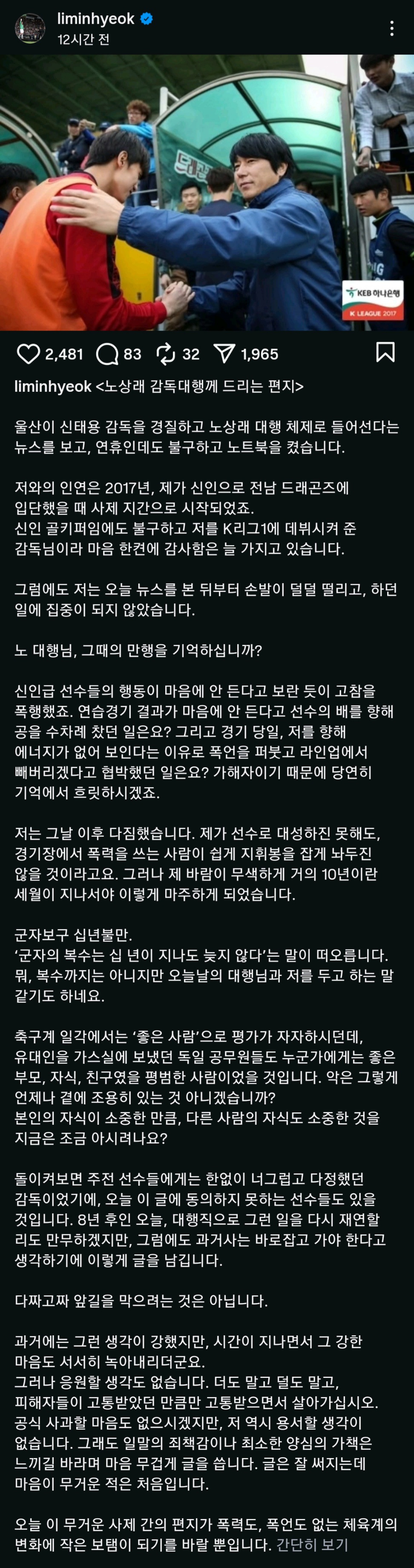 "뉴스 접한 순간 손발이 떨렸다"...'전 K리거' 임민혁, 울산 노상래 감독대행 과거 폭행 주장 작성자델피에로|작성시간25.10.10|조회수85 목록 댓글 0 글자크기 작게가 글자크기 크게가 "뉴스 접한 순간 손발이 떨렸다"...'전 K리거' 임민혁, 울산 노상래 감독대행 과거 폭행 주장"뉴스 접한 순간 손발이 떨렸다"...'전 K리거' 임민혁, 울산 노상래 감독대행 과거 폭행 주장[마이데일리 = 노찬혁 기자] 과거 전남 드래곤즈에서 골키퍼로 뛰었던 임민혁이 최근 울산 HD에 부임한 노상래 감독대행의 과거 선수 폭행 의혹을 공개적으로 주장했다. 울산은 9일 “성적 부진v.daum.net 다음검색 현재 게시글 추가 기능 열기 북마크 공유하기 신고 센터로 신고 댓글 댓글 0 댓글쓰기 답글쓰기 댓글 리스트