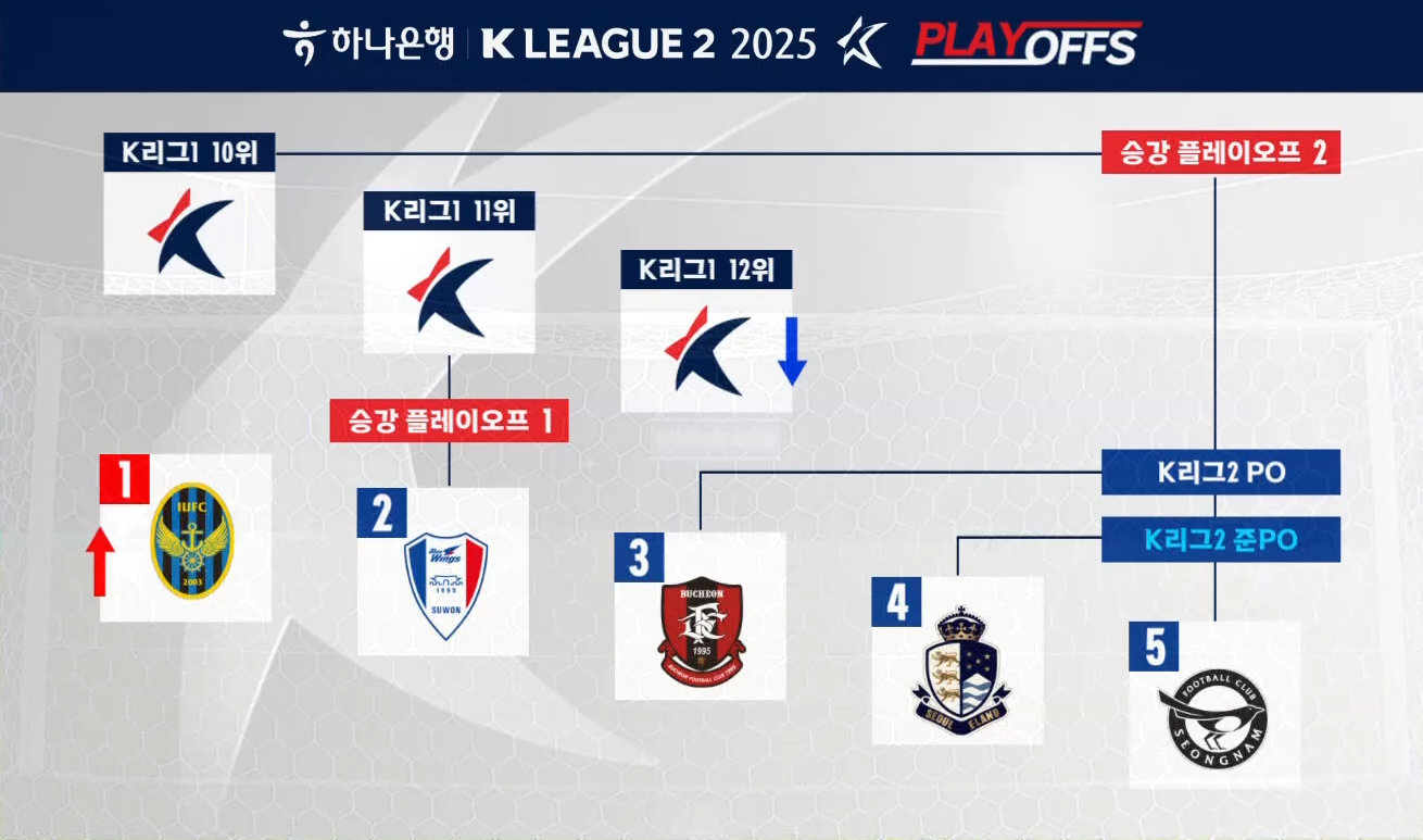 하나은행 K리그 2025 플레이오프 대진표 작성자델피에로|작성시간25.11.27|조회수72 목록 댓글 3 글자크기 작게가 글자크기 크게가 다음검색 현재 게시글 추가 기능 열기 북마크 공유하기 신고 센터로 신고 댓글 댓글 3 댓글쓰기 답글쓰기 댓글 리스트 작성자델피에로 작성자 본인 여부 작성자 | 작성시간 25.11.27 서울 이랜드 FC vs 성남FC 경기결과 이미지 확대 작성자델피에로 작성자 본인 여부 작성자 | 작성시간 25.11.27 부천FC1955 vs 성남FC2025. 11. 30. 14:00 부천종합운동장 작성자델피에로 작성자 본인 여부 작성자 | 작성시간 25.11.30 경기결과부천FC1955 0 vs 0 성남FC부천FC1955 승강 플레이오프 진출!부천FC1955가 수원FC와 승강 플레이오프에서 만납니다! 댓글 전체보기
